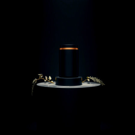 3d render of podium for product presentation. Black pedestal with gold elements.