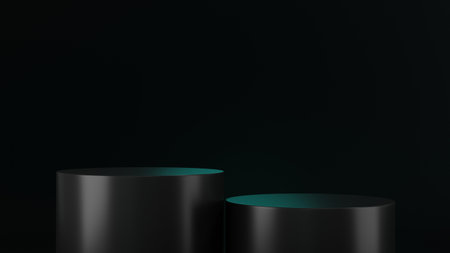 Abstract black scene with two cylinder podiums template for presentation cosmetic products, goods, advertising, design, poster, text, card in soft gradient, abstract mockup in beauty luxury style.