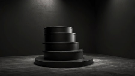 3D render of Cylinder podium with Black color on dark background. platform for product presentation minimal style. empty dark. Black pedestal for product showcase.