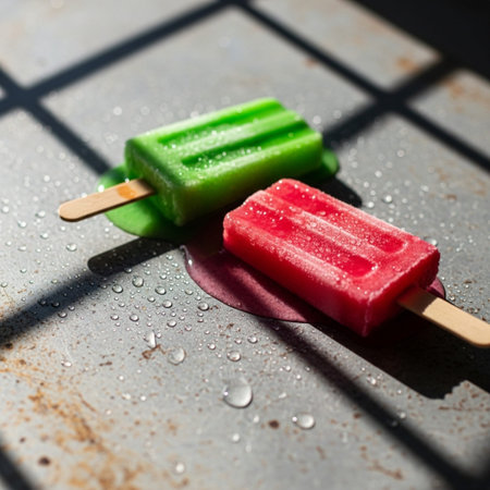 Melting popsicles sweating aggressively on a hot, dusty metal surface, shot cinematically in harsh s