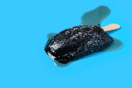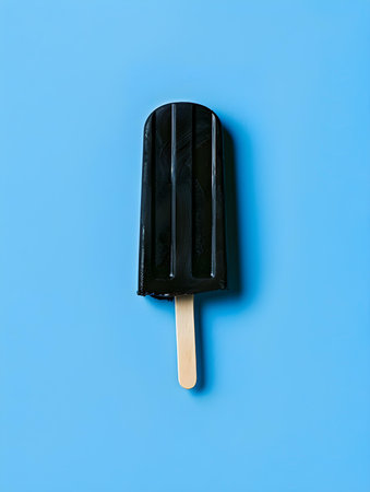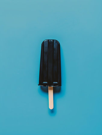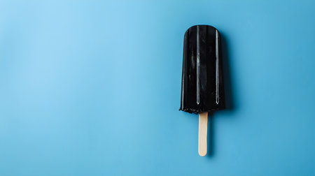 Black popsicle on a summery blue background with copy space