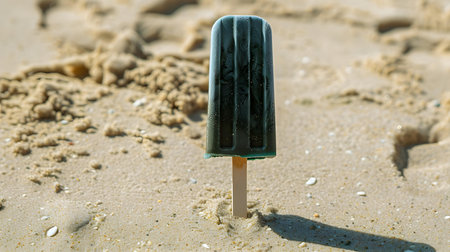 Dark Green Popsicle in the Sand on a Beach. Summer Vacation Background