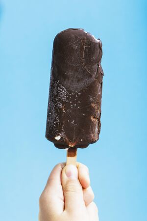 Woman's hand holding chocolate ice cream stick with blue colors background