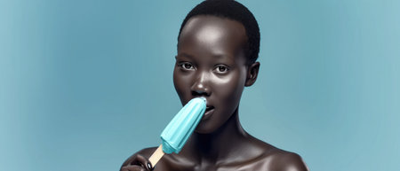 African Yearold Woman Eats Mint Chocolate Chip Ice Cream On Turquoise Background. Сoncept African Woman, Mint Chocolate Chip Ice Cream, Turquoise Background, Ice Cream Lover, Joyful Indulgence.