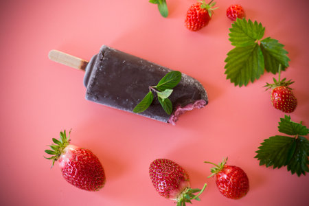 Homemade raspberry, ice lolly on rustic black background