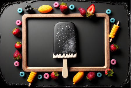 Black wooden backdrop with space for text and a color berry ice popsicle on a stick in the middle on a black plate handmade summer desserts with ice cream
