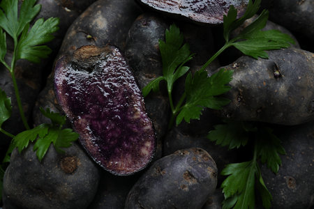 Violet potato Vitelotte, blue-violet raw potatoes close-up. Purple organic homegrown potato on black table background. Healthy vegan food, delicatessen
