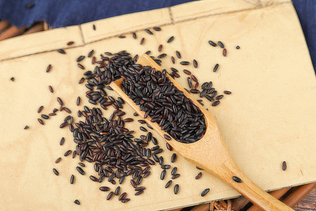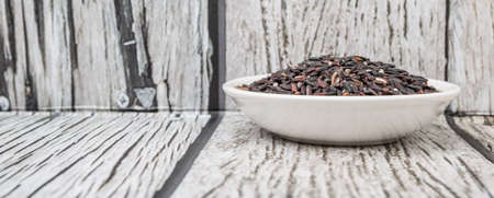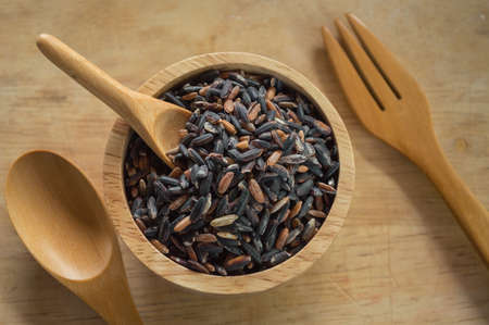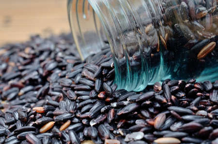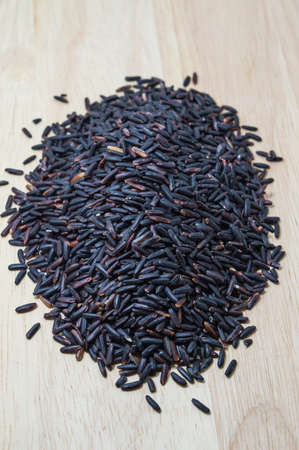 Black glutinous rice over wooden background