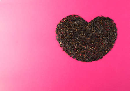 Raw Black Wild Rice Heart on Pink Paper Background Top View. Healthy Dietetic Canada Rice Cereal with Place for Text