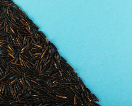 Raw Black Wild Rice on Blue Paper Background Top View. Healthy Dietetic Canada Rice Cereal Texture with Place for Text