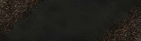 Wild Rice on Dark Stone Background Top View Flat Lay. Raw Black Bio Rice Cereal Topview with Copy Space