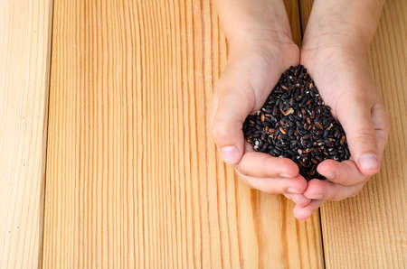 Hand holding of black riceberry on wooden background. Studio Photo