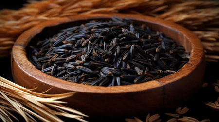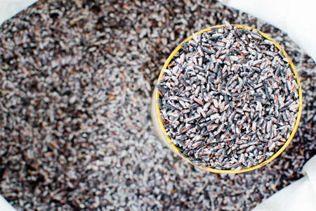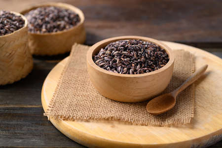 closeup details of Thai rice berry in bamboo black grounds, rice berry is a cross-bred unmilled rice possessing dark violet grain and Thai Hom Mali Rice (Selective Focus)