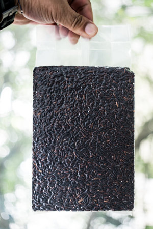 A man hand holding riceberry rice in a plastic vacuum bag