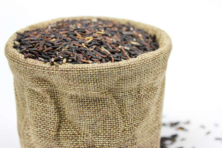 Rice berry in small burlap sack on white background.