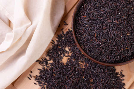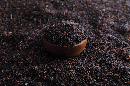Brown wooden scoop in a wooden bowl full of raw dry black rice grains against black rice seeds background. Unpolished organic black rice as source of complex carbohydrates for dieting and healthy eating. Top view.