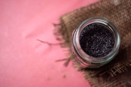 Black rice in a glass jar on a red background