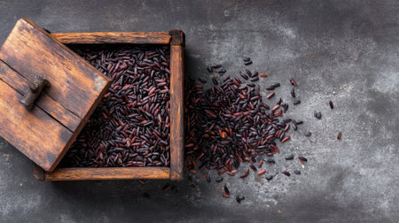 A captivating image of a rustic wooden box with an open lid, spilling black rice onto a dark textured surface, creating an inviting culinary scene.