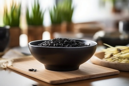 bowl of jasmine black rice on black backgrounds