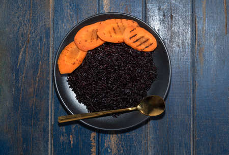Black rice in plate with vegetable carrot has spoon isolated on blue wood background close up, top view, healthy food and drink concept.