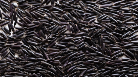 Black wild rice kernels; radial pattern texture; organic food ingredient background