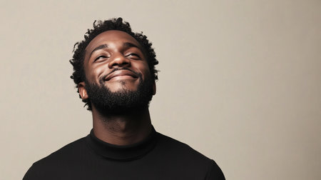 A hopeful African American man gazes upward with a smile, embodying positivity and inspiration. This portrait captures joy and contemplation in a serene setting.