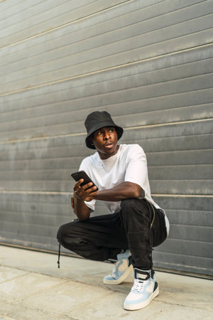 A young cool black male in a street style outfit posing while holding his phone