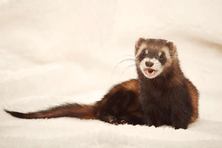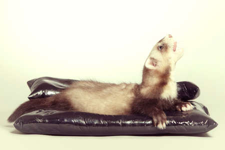 Young ferret baby posing in studio on ceramic bed