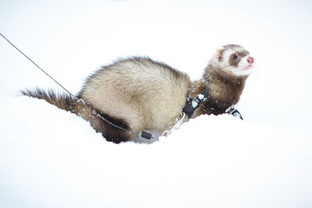 Nice young ferret outing in winter daytime park on harness