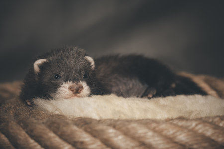 Dark sable five weeks old ferret baby posing for portrait on hemp rope