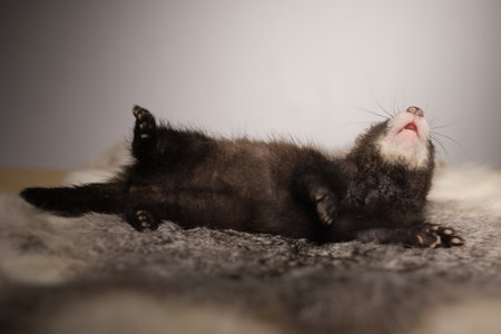 Ferret five weeks old baby posing for portrait on rabbit fur