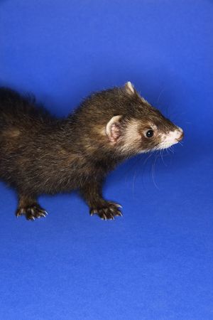 Portrait of brown ferret against blue background.