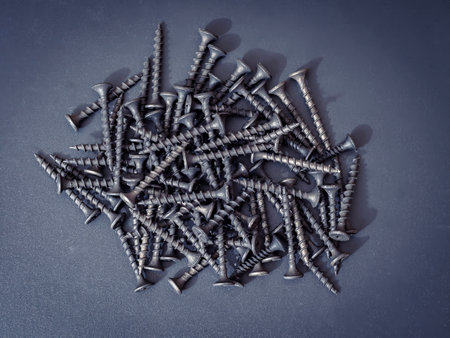 Steel self-tapping screws used in handicrafts background texture, close up, tinted
