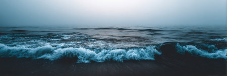 Gentle ocean waves lap against the shore at dawn, surrounded by a blanket of mist and soft, diffused light illuminating the waters surface.