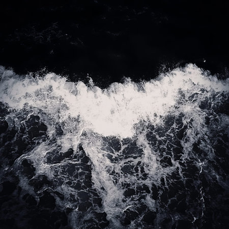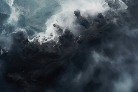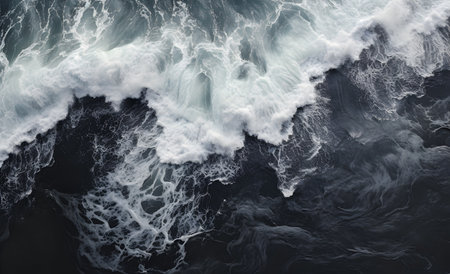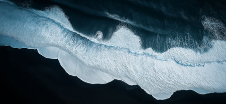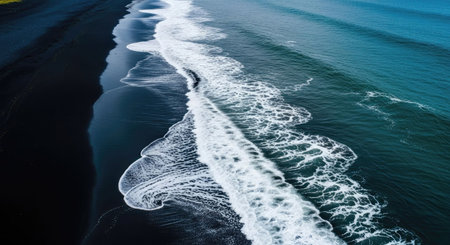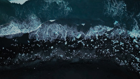 Stunning aerial perspective of ocean waves with white foam crashing on the black sand beach, showcasing the raw beauty of Icelandic nature