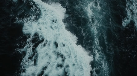 Aerial view of tumultuous ocean waves showcasing intricate foam patterns. The deep blue waters create a dynamic and captivating natural scene.