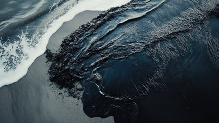 An aerial perspective captures the raw power of ocean waves crashing onto a unique black sand beach, highlighting the stark beauty of the natural coastal landscape.