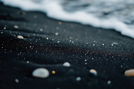 Close up of black sand beach being washed by a soft wave, with small white pebbles scattered across the surface