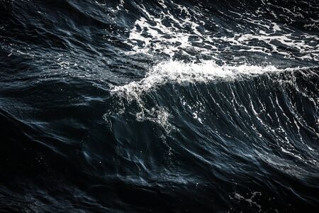 Dark blue-green color of water surface with waves in middle of endless deep sea. Endless wavy expanse of blue sea water. Dark blue waves in deep ocean. Raging aquamarine waves on surface of the water.