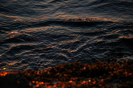 Abstract nature summer ocean sunset sea background. Small waves on water surface in motion blur with bokeh lights from sunrise. Holiday, vacation and recreational background concept