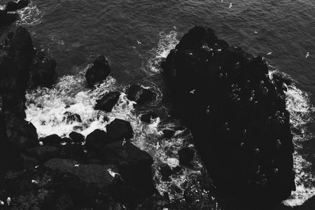 White seagulls flying over black rocks and cold blue waters of Atlantic Ocean near Iceland's coast. Black and white