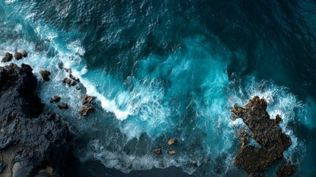 This photo captures an expansive aerial view of the ocean with rocks protruding from its surface, Piercing aerial view of jagged rocks amidst raging sea waves, AI Generated