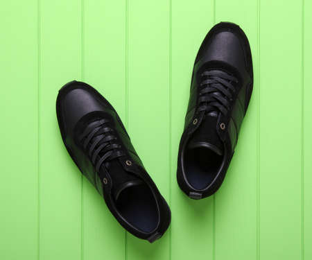 Black sports sneakers on the floor. Top view
