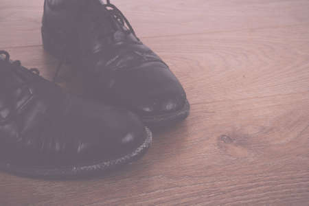 Man black shoes on a black wooden floor. Business flat lay background with a copy space.