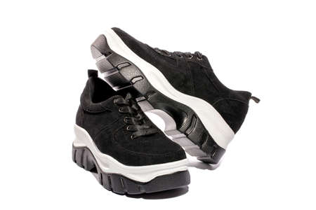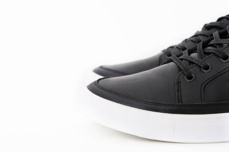 Mans black leather shoes. Close-up of a pair of black sneakers or sport shoes with laces isolated on a white background. Elegant and trendy mens footwear