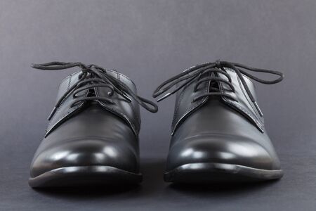 Close up picture of mens footwear. Black leather elegant shoes on grey background