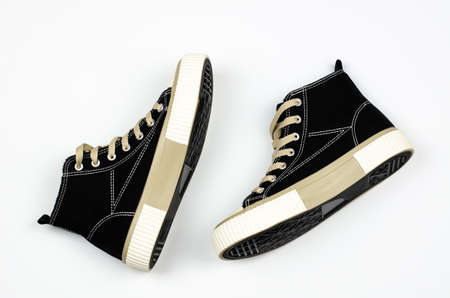 A pair of sports shoes on a white background. Stylish black sneakers on a white background, flat lay.