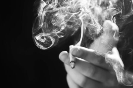 A man smokes cannabis weed, a joint and a lighter in his hands. Smoke on a black background. Concepts of medical marijuana use and legalization of the cannabis. On a black background