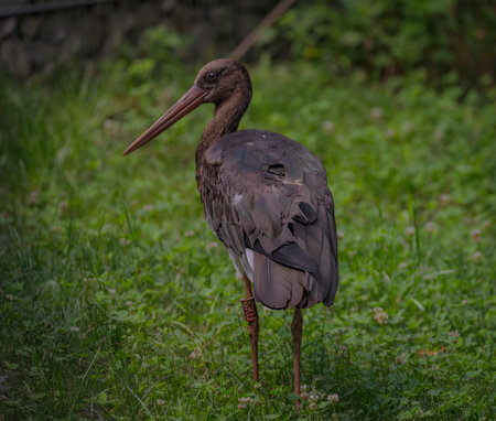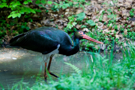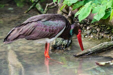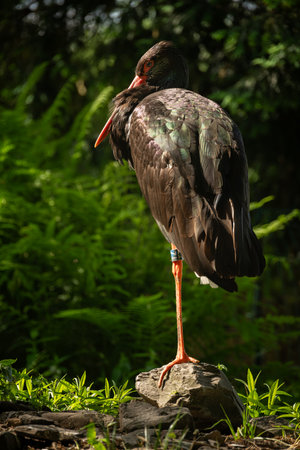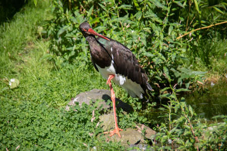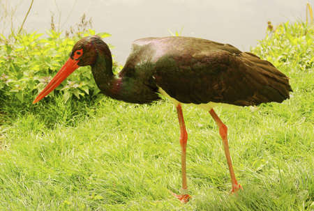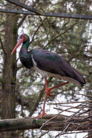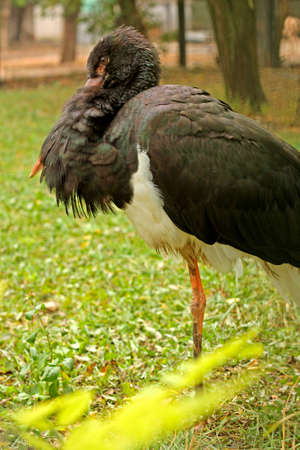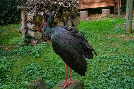Ciconia nigra, black stork staying on the one foot in the zoo, animal background