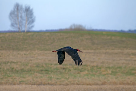 A black stork (Ciconia nigra) flies over a spring field. The black stork characterized by very hidden behavior, so watching of this bird in an open place is a great rarity.